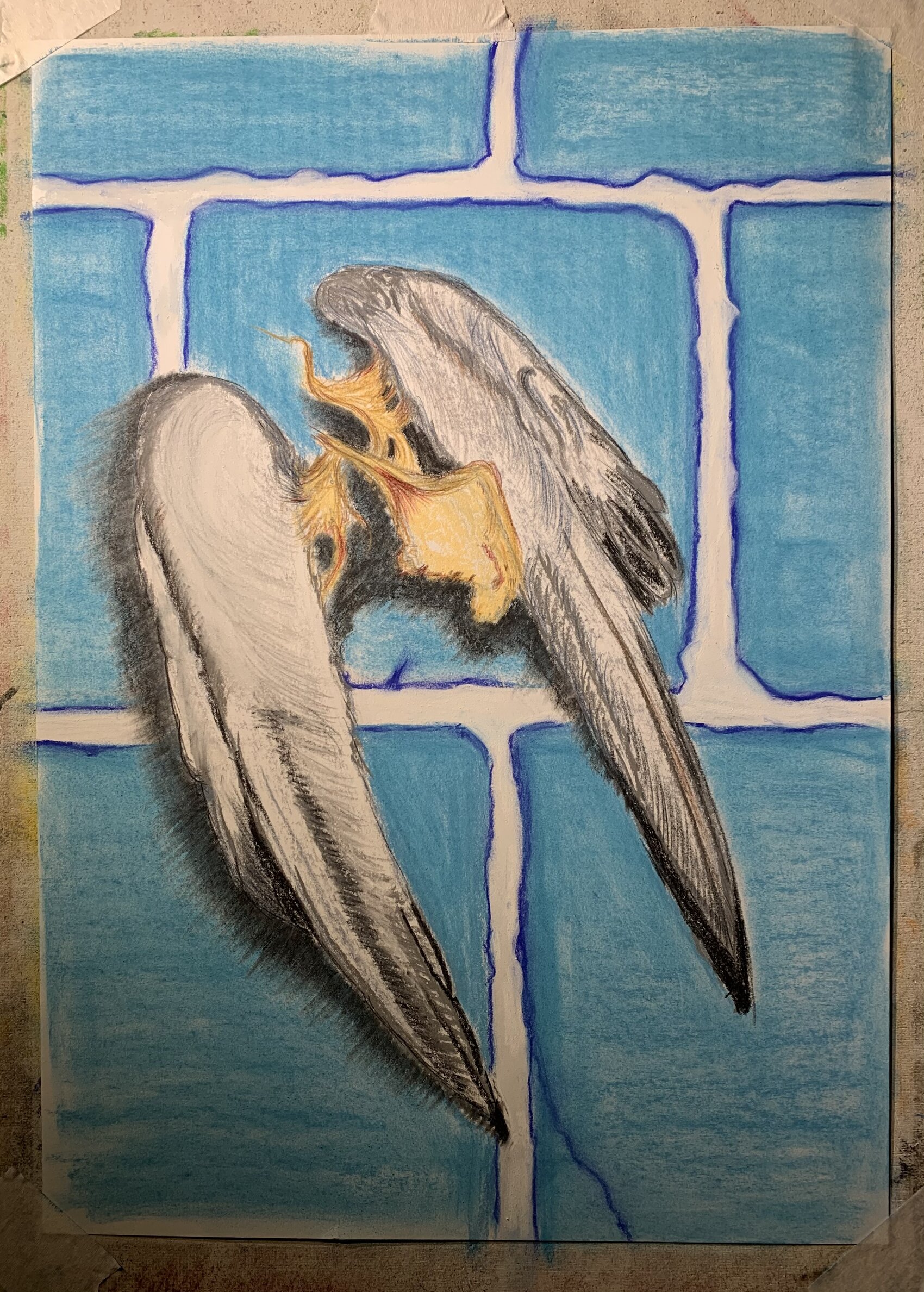 Het kadaver lag ergens op de kasseien in een grote stad. De kasseiën kleurde ik hemelsblauw - zodat de duif kon wegvliegen van haar aards bestaan.
