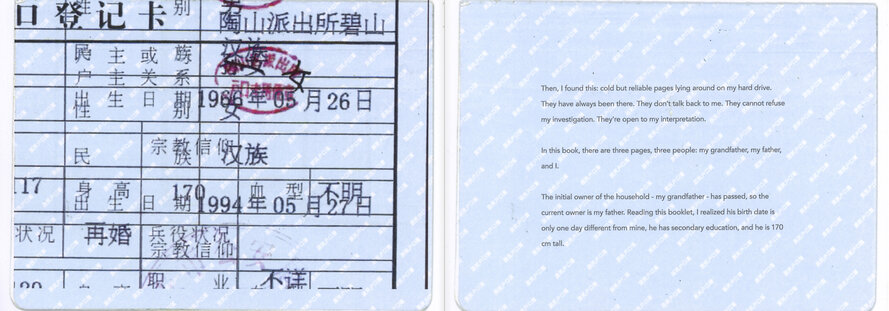 This project takes its starting point from the hukou, the Chinese family register that functions like a domestic passport. Each household has only one, usually kept by the father. Eight years ago, I stole mine.
