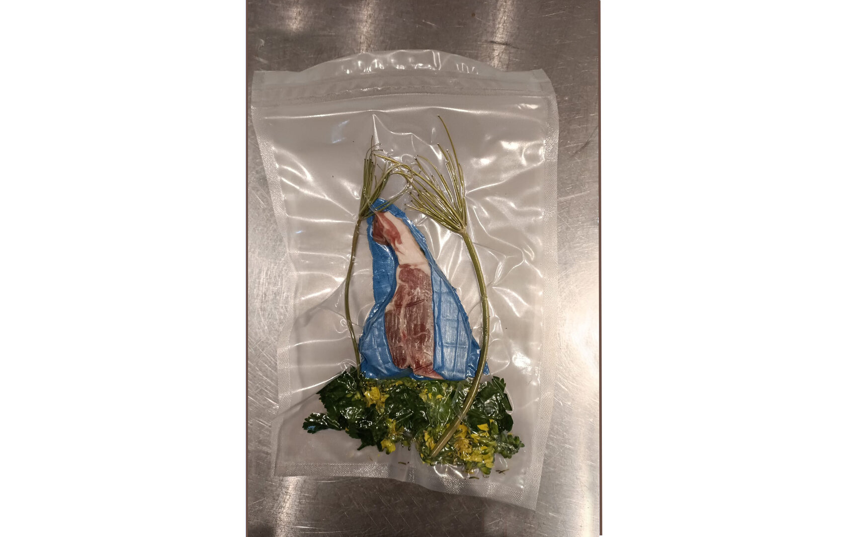 Never having thought of muses my mind drifted to iconic muses and how they have always been female, youthfull, squeeky clean and immortalized. I saw the opportunity to make a piece that would wither in time, fester, rot and stench and hoped it would be beautiful. I made a semblance of mary out a lamb chop and floorcloth. The religious symbolics of the lamb and the sexist assumption of cleaning utensils made an image exceeding my expectations.