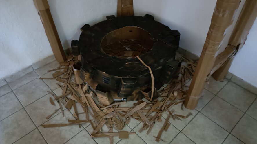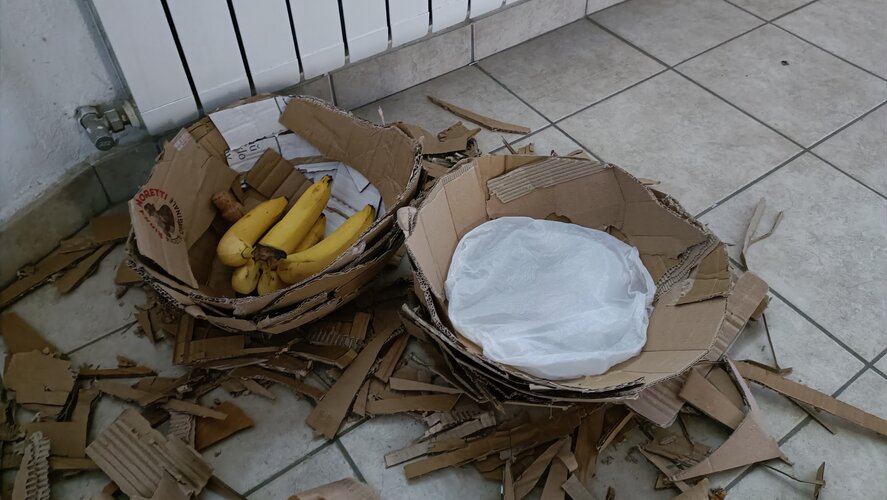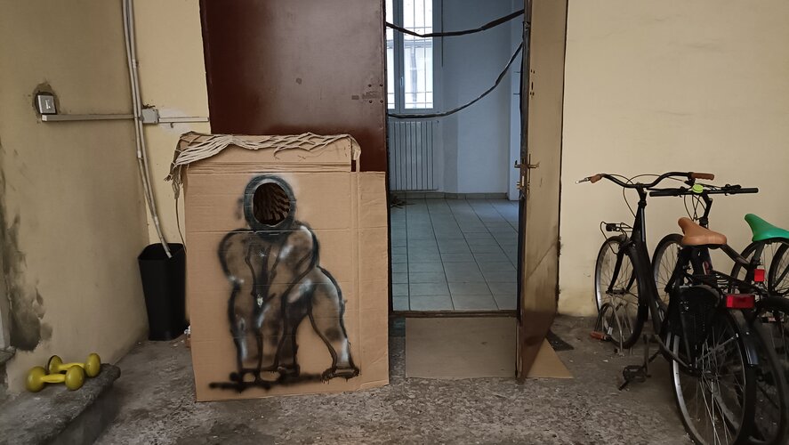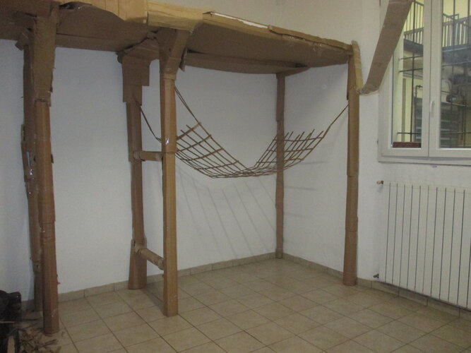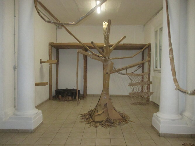 This installation is made entirely out of cardboard and means to resemble the habitat of primates in a Zoo.